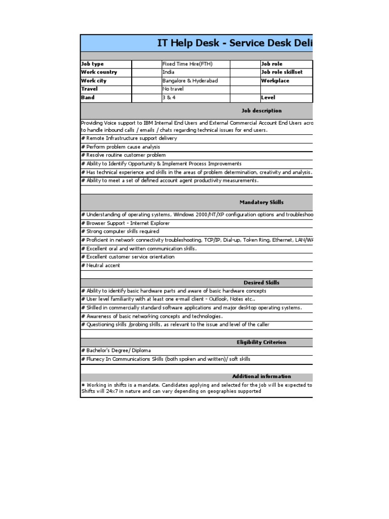Doe you'll love this job. Includes help desk job summary, duties & responsibilities, requirements & qualifications. Responsibilities include maintenance of it equipment throughout the environment, managing multiple customer requests simultaneously including troubleshooting of all it related equipment such as pcs, wireless handheld devices, thin clients. See examples of help desk technician job descriptions from real companies. Help desk resumes are filled with past training experience that would indicate that the associate takes their career seriously. Because of the nature of the job, some companies may require their it support to undertake shift work. Proven working experience in providing help desk support proficiency in english working knowledge of help desk software, databases and remote control They service customer requests in person, over the telephone and through emails. Ensuring customer service is timely and accurate on a daily basis. As a help desk manager, you should have a solid technical background combined. Indeed may be compensated by these employers, helping keep indeed free for jobseekers. It help desk cv ctgoodjobs powered by career times. Displayed here are job ads that match your query.